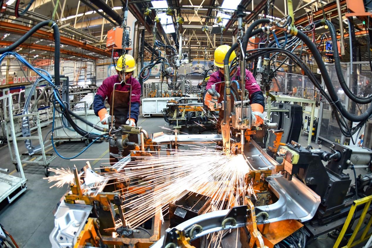 Welders work at the manufacturing shop of an automaker in Qingzhou city, east China’s Shandong province, Oct. 31, 2021. (People’s Daily Online/Wang Jilin)