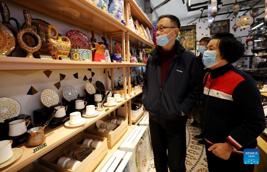 People look at Turkish artworks while visiting the "CIIE Fair" on the Nanjing Road pedestrian walkway in Shanghai, east China, Nov. 8, 2021. The 4th China International Import Expo (CIIE) is held in Shanghai from Nov. 5 to Nov. 10. (Xinhua/Fang Zhe)