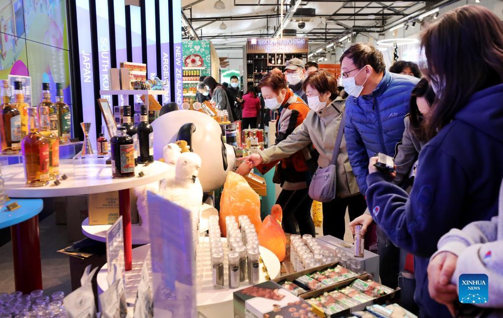 People buy products while visiting the "CIIE Fair" on the Nanjing Road pedestrian walkway in Shanghai, east China, Nov. 8, 2021. The 4th China International Import Expo (CIIE) is held in Shanghai from Nov. 5 to Nov. 10. (Xinhua/Fang Zhe)