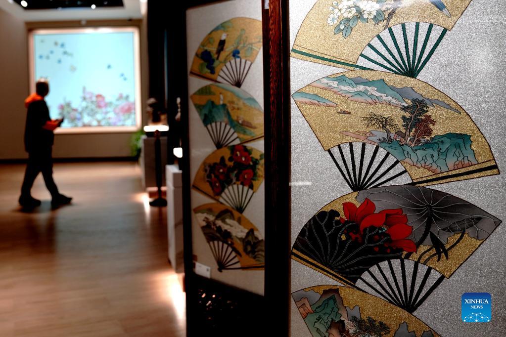 A visitor looks at decorative screens from east China's Jiangsu Province while visiting the China International Import Expo (CIIE) at the National Exhibition and Convention Center (Shanghai) in Shanghai, east China, Nov. 8, 2021. The ongoing 4th China International Import Expo (CIIE) is held in Shanghai from Nov. 5 to Nov. 10. (Xinhua/Zhang Jiansong)