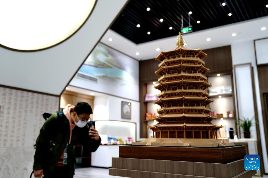 A man takes photos of the miniature model of an ancient wooden tower in north China's Shanxi Province while visiting the China International Import Expo (CIIE) at the National Exhibition and Convention Center (Shanghai) in Shanghai, east China, Nov. 8, 2021. The ongoing 4th China International Import Expo (CIIE) is held in Shanghai from Nov. 5 to Nov. 10. (Xinhua/Zhang Jiansong)