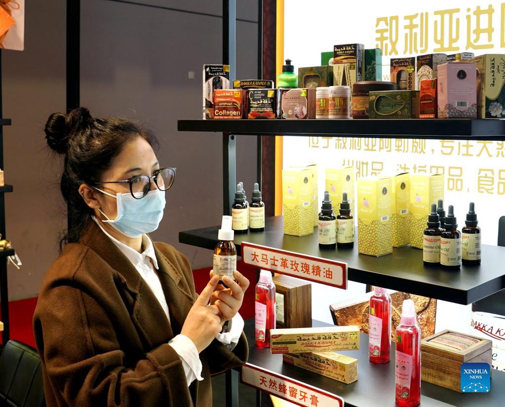 A staff member introduces Syrian essential oil products at the 4th China International Import Expo (CIIE) in east China's Shanghai, Nov. 8, 2021. (Xinhua/Liu Ying)