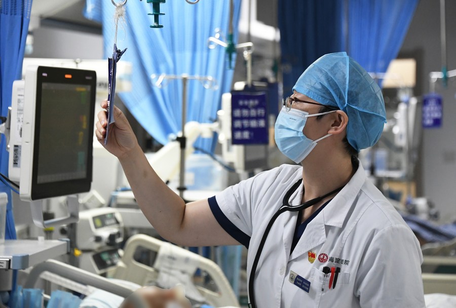 Doctor Zhang Xinyan checks a patient's treatment plan at an intensive care unit (ICU) of the Beijing Haidian Hospital in Beijing, capital of China, Oct. 1, 2021. (Xinhua/Ren Chao)