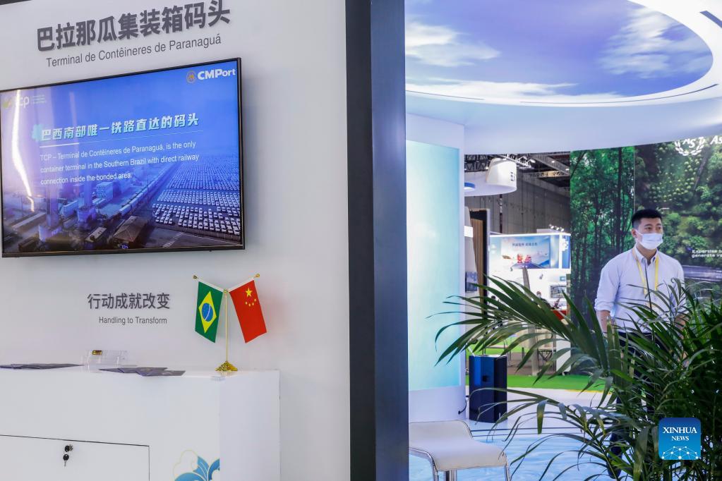 Photo taken on Nov. 7, 2021 shows an exhibition board of Brazil's Paranagua container terminal at the Trade in Services Exhibition Area of the 4th China International Import Expo (CIIE) in east China's Shanghai. Numerous businesses from countries along the Belt and Road are showcasing their products and services at the Trade in Services Exhibition Area of the ongoing 4th CIIE. (Xinhua/Zhang Yuwei)