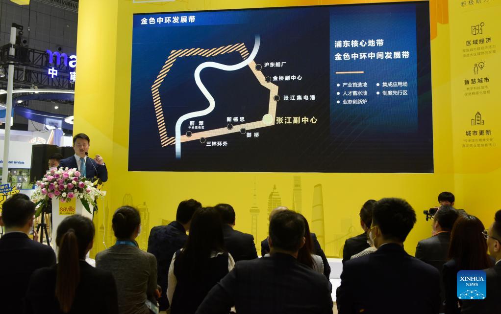 People take part in an event at the Savills booth at the Trade in Services Exhibition Area of the 4th China International Import Expo (CIIE) in east China's Shanghai, Nov. 7, 2021. The 4th China International Import Expo (CIIE) has drawn over 300 businesses from over 50 countries and regions at its Trade in Services Exhibition Area. (Xinhua/Xu Liang)