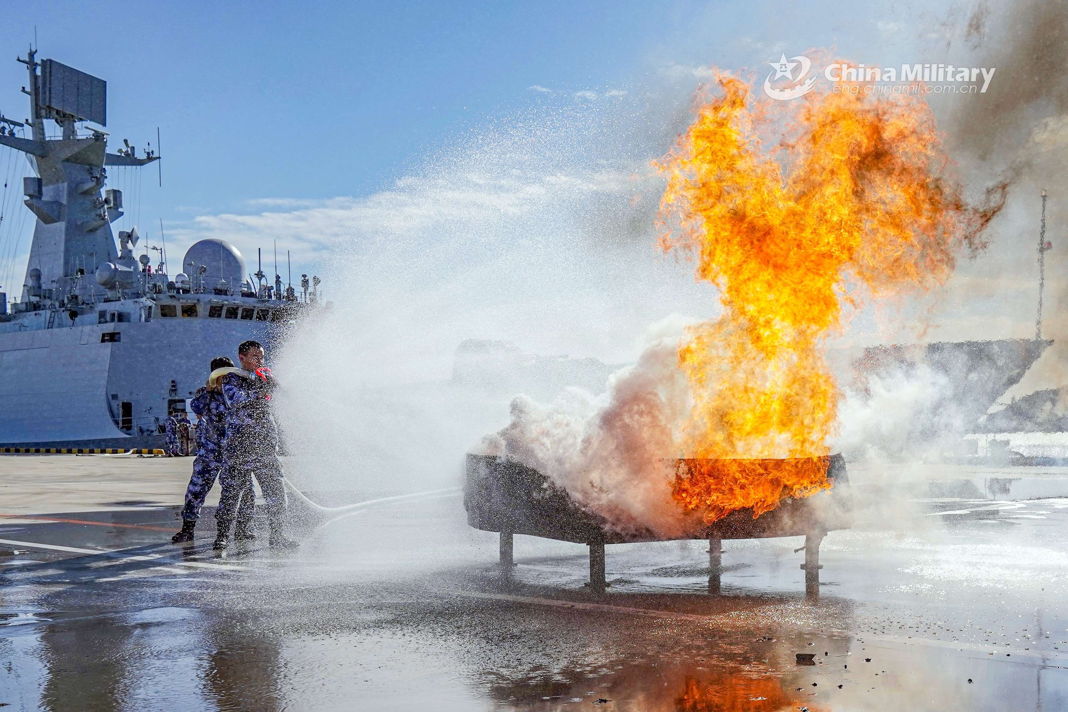 Sailors assigned to a destroyer flotilla with the navy under the PLA Northern Theater Command man a hose for high-pressure extinction during a recent damage control drill at a military port on October 11, 2021. (eng.chinamil.com.cn/Photo by Zhang Yan)