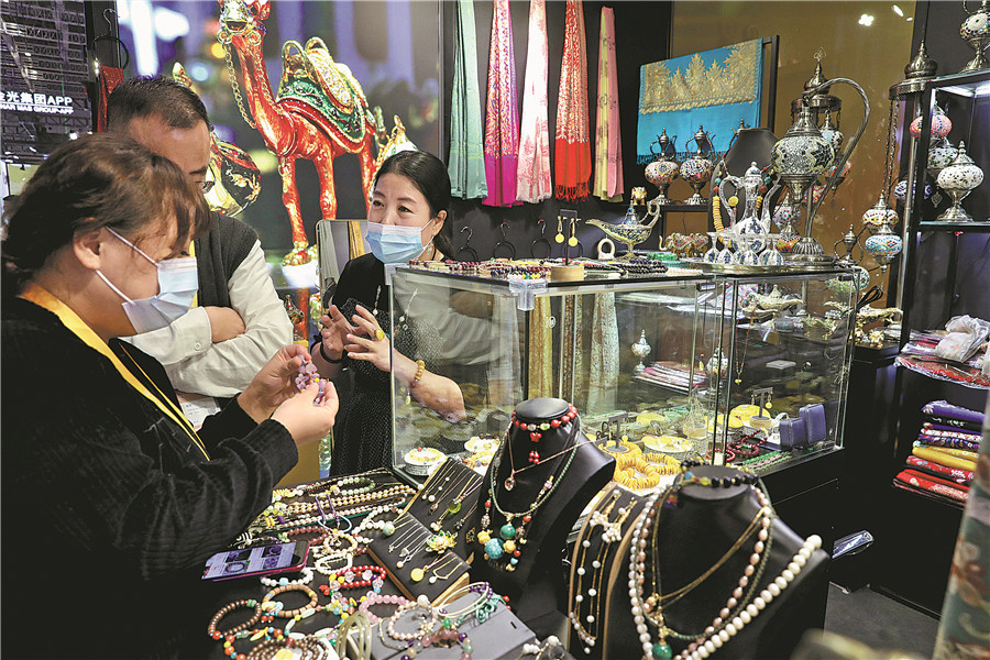 Visitors look at jewelry from Oman on Monday at a booth at the China International Import Expo in Shanghai, which closes on Wednesday. Countries involved in the Belt and Road Initiative are displaying their exotic goods at this year's CIIE. ZHU XINGXIN/CHINA DAILY