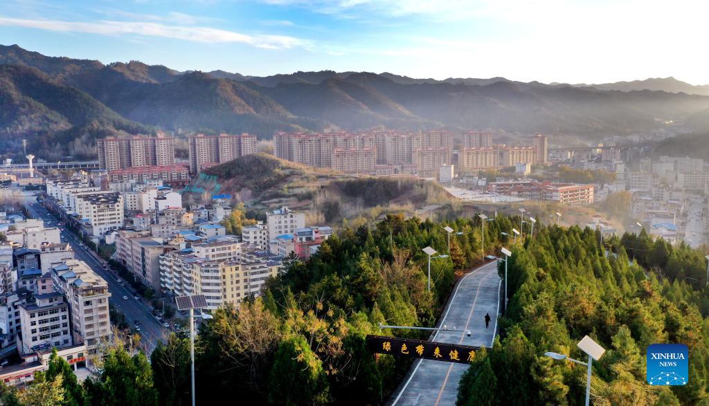Aerial photo taken on Nov. 9, 2021 shows a park in Shangnan County, a remote town tucked in the Qinling Mountains, in northwest China's Shaanxi Province. (Xinhua/Tao Ming)
