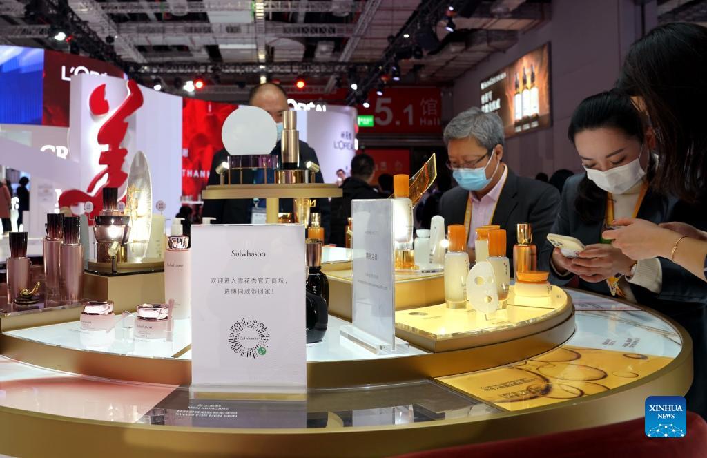 QR code for on-line purchase is seen at a booth at the Consumer Goods Exhibition Area of the 4th China International Import Expo (CIIE) in east China's Shanghai, Nov. 9, 2021. Lots of exhibitors at the 4th CIIE resort to livestreaming promotion at their booths to attract on-line buyers for items displayed on-site. (Xinhua/Liu Ying)