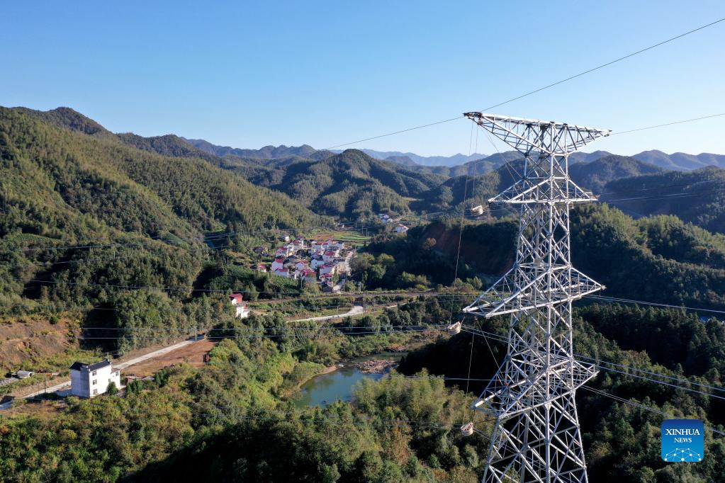 Aerial photo taken on Nov. 8, 2021 shows power transmission towers in Qimen County of Huangshan City, east China's Anhui Province. A 110KV power transmission and transformation project is under construction in deep mountains in Qimen County. The total length of this project is about 30 kilometers. It is expected to be put into operation by the end of November this year. (Photo by Zhao Xianfu/Xinhua)