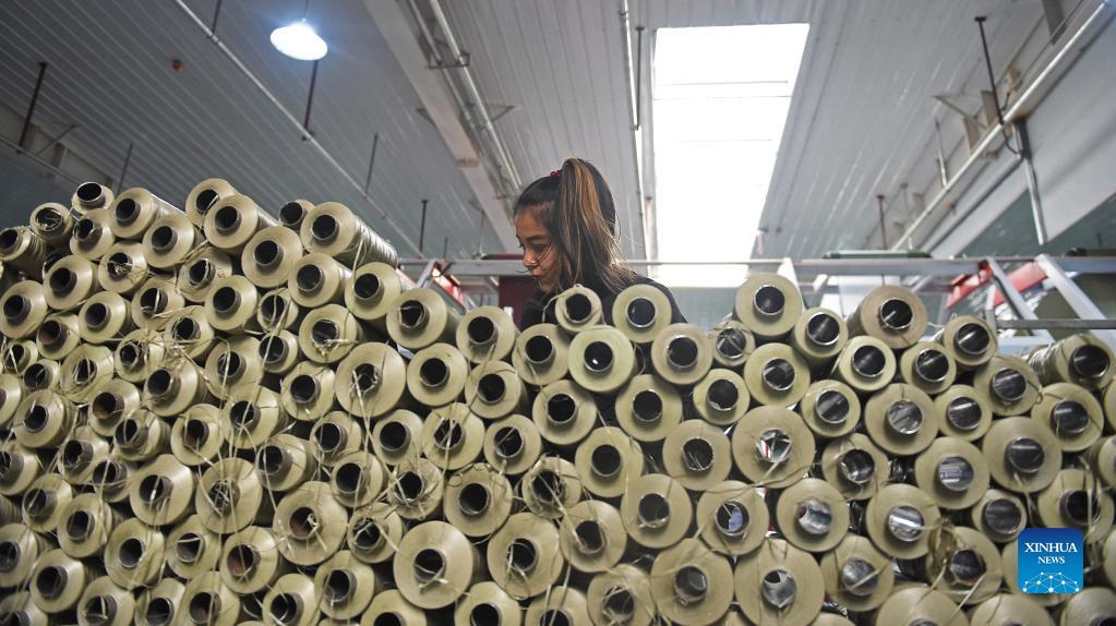 A worker works at a packaging material industrial park at Yopurga County in Kashgar, northwest China's Xinjiang Uygur Autonomous Region, Nov. 8, 2021. The industrial park, mainly engaged in the production and sales of packaging materials such as woven bags, has attracted a total of 19 enterprises, providing 1,500 jobs for local residents. (Xinhua/Hou Zhaokang)