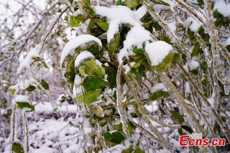 Ice covers the branches and leaves in Harbin, Heilongjiang Province, Nov. 9, 2021. (Photo/Sun Hanlun)