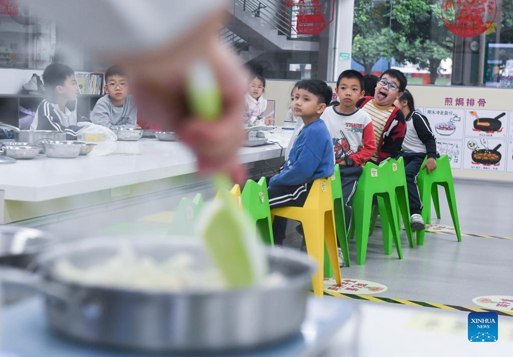 Pupils learn to cook at the Little Chef training center in Xishan Primary School in Shunde District of Foshan City, south China's Guangdong Province, Nov. 9, 2021. Xishan Primary School in Shunde has set up a Little Chef training center since September this year on its school campus in cooperation with Shunde Fengchu Vocational Skills Training School, providing students with a cooking class of 45 minutes after school every day. Professional cooking instructors, together with school teachers, give cooking lessons suitable for different ages at the training center. In the class, pupils can learn and practice the cooking of Chinese and Western cuisine, including making some easy-to-learn local Shunde specialties. Through the cooking course, pupils may learn about different food materials, understand how to prepare them, as well as build basic culinary skills and savor the dishes cooked by themselves. The course is open to students in all grades of school. There is one class provided each day and each class is attended by 60 students. The Little Chef cooking course has been well received by students and their parents since its launch. (Xinhua/Mao Siqian)