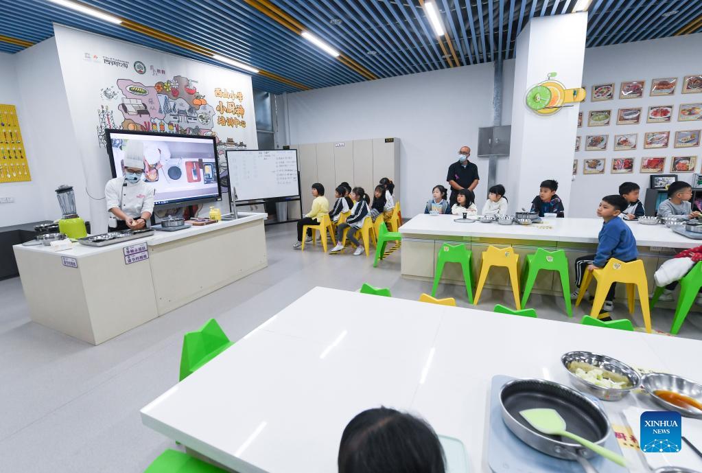 A teacher instructs pupils in cooking at the Little Chef training center in Xishan Primary School in Shunde District of Foshan City, south China's Guangdong Province, Nov. 9, 2021. Xishan Primary School in Shunde has set up a Little Chef training center since September this year on its school campus in cooperation with Shunde Fengchu Vocational Skills Training School, providing students with a cooking class of 45 minutes after school every day. Professional cooking instructors, together with school teachers, give cooking lessons suitable for different ages at the training center. In the class, pupils can learn and practice the cooking of Chinese and Western cuisine, including making some easy-to-learn local Shunde specialties. Through the cooking course, pupils may learn about different food materials, understand how to prepare them, as well as build basic culinary skills and savor the dishes cooked by themselves. The course is open to students in all grades of school. There is one class provided each day and each class is attended by 60 students. The Little Chef cooking course has been well received by students and their parents since its launch. (Xinhua/Mao Siqian)