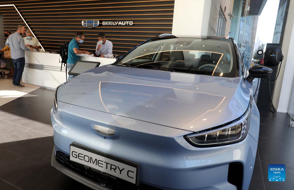 People visit a car company selling electric cars made by China's Geely Auto in Tel Aviv, Israel, on Nov. 10, 2021. Chinese automaker Geely Auto Group has started selling electric cars in Israel through the Israeli dealership Union Group. (Photo by Gil Cohen Magen/Xinhua)