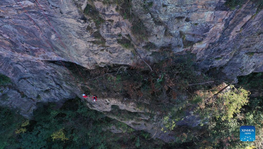 Aerial photo taken on Nov. 10, 2021 shows members of an emergency rescue team rappelling down a cliff to collect litters during an emergency drill at Huangshizhai Village of Wulingyuan, Zhangjiajie, central China's Hunan Province. Members of this non-profit organization regularly collect litters from precipitous cliffs in and around Wulingyuan, a scenic site on the World Natural Heritage List of UNESCO. (Xinhua/Zhao Zhongzhi)