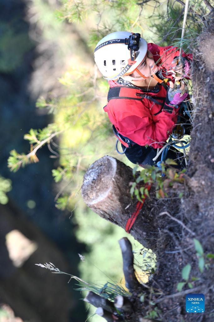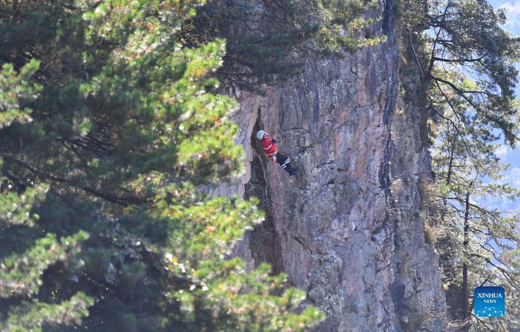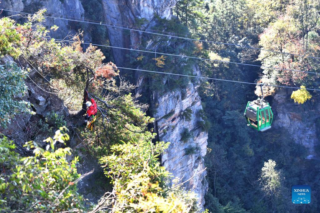An emergency rescue team member rappels down a cliff to collect litters during an emergency drill at Huangshizhai Village of Wulingyuan, Zhangjiajie, central China's Hunan Province, Nov. 10, 2021. Members of this non-profit organization regularly collect litters from precipitous cliffs in and around Wulingyuan, a scenic site on the World Natural Heritage List of UNESCO. (Xinhua/Zhao Zhongzhi)