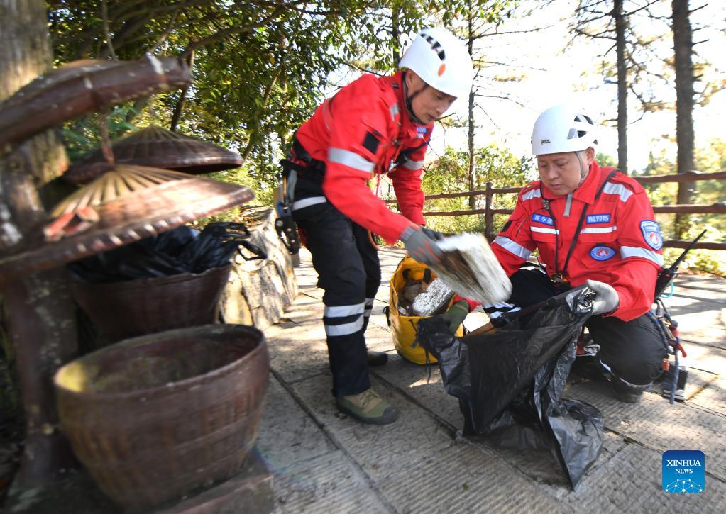 Members of an emergency rescue team pack litters collected during an emergency drill at Huangshizhai Village of Wulingyuan, Zhangjiajie, central China's Hunan Province, Nov. 10, 2021. Members of this non-profit organization regularly collect litters from precipitous cliffs in and around Wulingyuan, a scenic site on the World Natural Heritage List of UNESCO. (Xinhua/Zhao Zhongzhi)