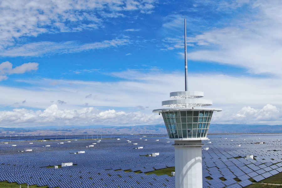 Aerial photo taken on Aug. 17, 2020 shows a photovoltaic power station at a green industrial development park in the Tibetan Autonomous Prefecture of Hainan, northwest China's Qinghai Province. (Xinhua/Zhang Long)