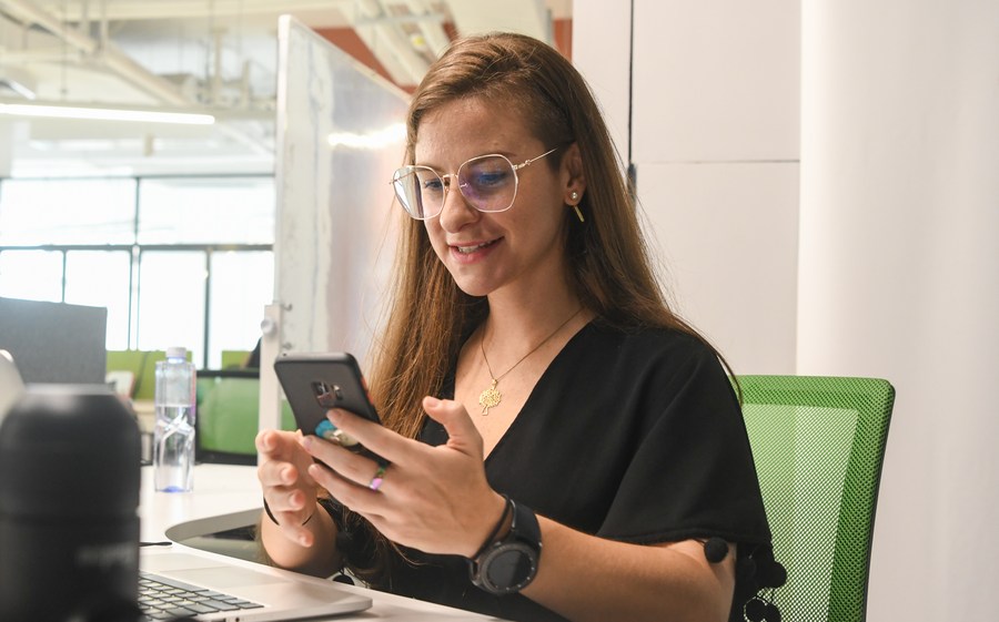 Photo taken on Nov. 4, 2021 shows Camila Ghattas working in an industrial park of Haikou, capital of south China's island province of Hainan. (Xinhua/Yang Guanyu)