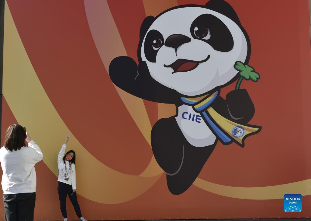 Visitors take photos with Jinbao, mascot of the China International Import Expo (CIIE) in east China's Shanghai, Nov. 5, 2021. The 4th CIIE concluded here on Wednesday. (Xinhua/Jin Liwang)