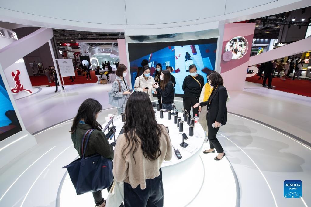 Visitors learn about beauty products at the Consumer Goods Exhibition Area of the 4th China International Import Expo (CIIE) in east China's Shanghai, Nov. 8, 2021. The 4th CIIE concluded here on Wednesday. (Xinhua/Meng Tao)