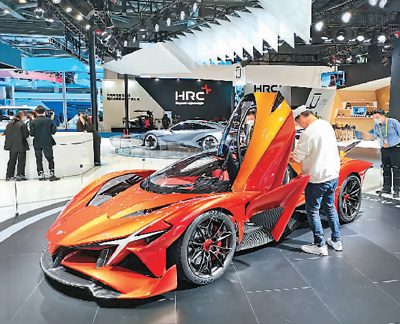 Visitors look over a new energy race car produced by Apollo displayed at the 4th China International Import Expo (CIIE) in Shanghai. (People’s Daily Overseas Edition/Qiu Haifeng)