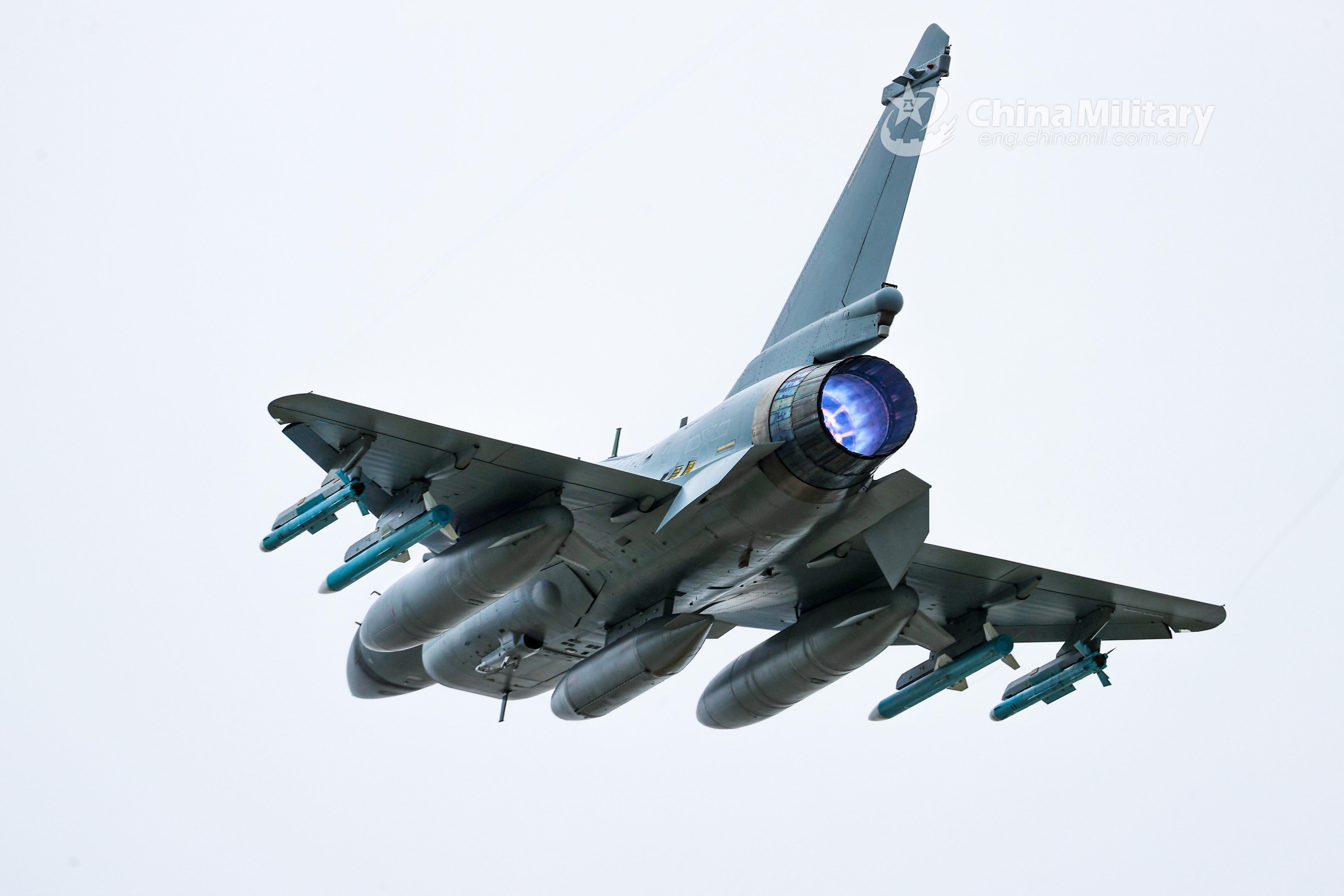 A J-10 fighter jet attached to an aviation brigade of the air force under the PLA Southern Theater Command takes off during a flight training exercise on October 11, 2021. (eng.chinamil.com.cn/Photo by Wang Guoyun)