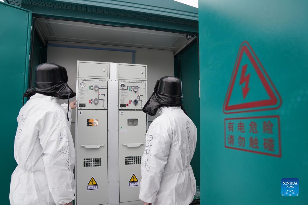 Members of a power maintenance team inspect the power equipment outside a mobile laboratory for conducting COVID-19 tests in Aihui District of Heihe, northeast China's Heilongjiang Province, Nov. 10, 2021. The State Grid Heihe power supply company temporarily set up a comprehensive team composed of 12 employees to maintain the power supply of important facilities. (Xinhua/Wang Song)