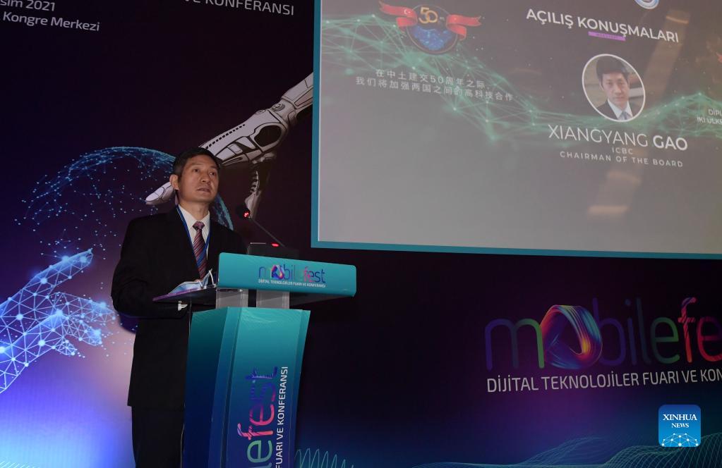 Gao Xiangyang, chairman of the Industrial and Commercial Bank of China (ICBC) Turkey, speaks at the 2nd Mobilefest Digital Technologies Fair and Conference in Istanbul, Turkey, on Nov. 11, 2021. A major digital technologies fair opened on Thursday in Istanbul with a specific focus on China and its technologies. The 2nd Mobilefest Digital Technologies Fair and Conference began with a motto of "Strengthening Technological Ties Between China and Turkey," as the two countries marked the 50th anniversary of the establishment of their diplomatic relations this year. (Xinhua/Sadat)