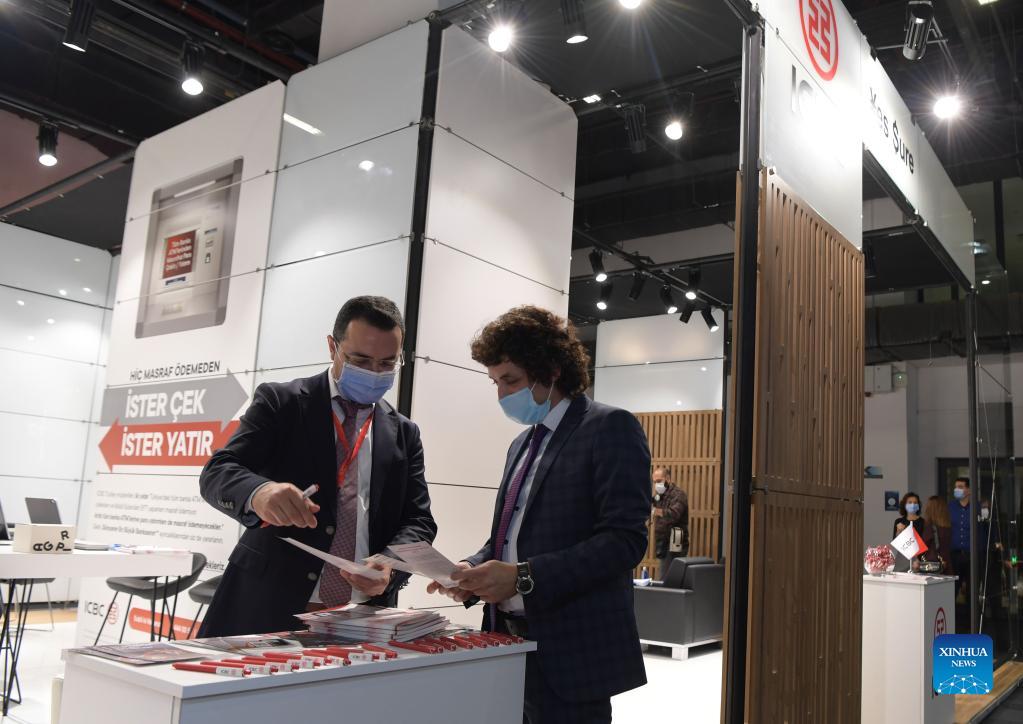 A staff member talks with a visitor at the booth of the Industrial and Commercial Bank of China (ICBC) Turkey at the 2nd Mobilefest Digital Technologies Fair and Conference in Istanbul, Turkey, on Nov. 11, 2021. A major digital technologies fair opened on Thursday in Istanbul with a specific focus on China and its technologies. The 2nd Mobilefest Digital Technologies Fair and Conference began with a motto of "Strengthening Technological Ties Between China and Turkey," as the two countries marked the 50th anniversary of the establishment of their diplomatic relations this year. (Xinhua/Sadat)
