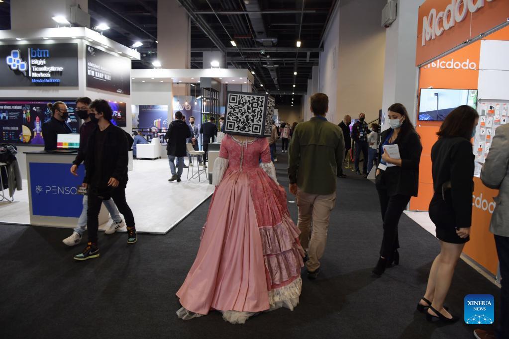 People attend the 2nd Mobilefest Digital Technologies Fair and Conference in Istanbul, Turkey, on Nov. 11, 2021. A major digital technologies fair opened on Thursday in Istanbul with a specific focus on China and its technologies. The 2nd Mobilefest Digital Technologies Fair and Conference began with a motto of "Strengthening Technological Ties Between China and Turkey," as the two countries marked the 50th anniversary of the establishment of their diplomatic relations this year. (Xinhua/Sadat)