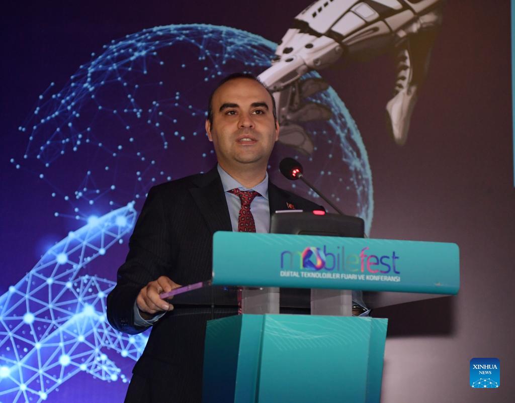 Mehmet Fatih Kacir, Turkey's deputy minister of industry and technology, speaks at the 2nd Mobilefest Digital Technologies Fair and Conference in Istanbul, Turkey, on Nov. 11, 2021. A major digital technologies fair opened on Thursday in Istanbul with a specific focus on China and its technologies. The 2nd Mobilefest Digital Technologies Fair and Conference began with a motto of "Strengthening Technological Ties Between China and Turkey," as the two countries marked the 50th anniversary of the establishment of their diplomatic relations this year. (Xinhua/Sadat)