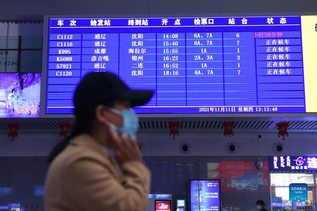 A passenger walks past an information screen at Tongliao railway station in Tongliao, north China's Inner Mongolia Autonomous Region, Nov. 11, 2021. Tongliao City in north China's Inner Mongolia has been walloped by the strongest snowstorm ever recorded. Faced with the recent cold weather and snowstorms, the local authorities have launched an emergency program to ensure transportation safety, power supply as well as agricultural and husbandry production, guaranteeing people's normal life. (Xinhua/Liu Lei)
