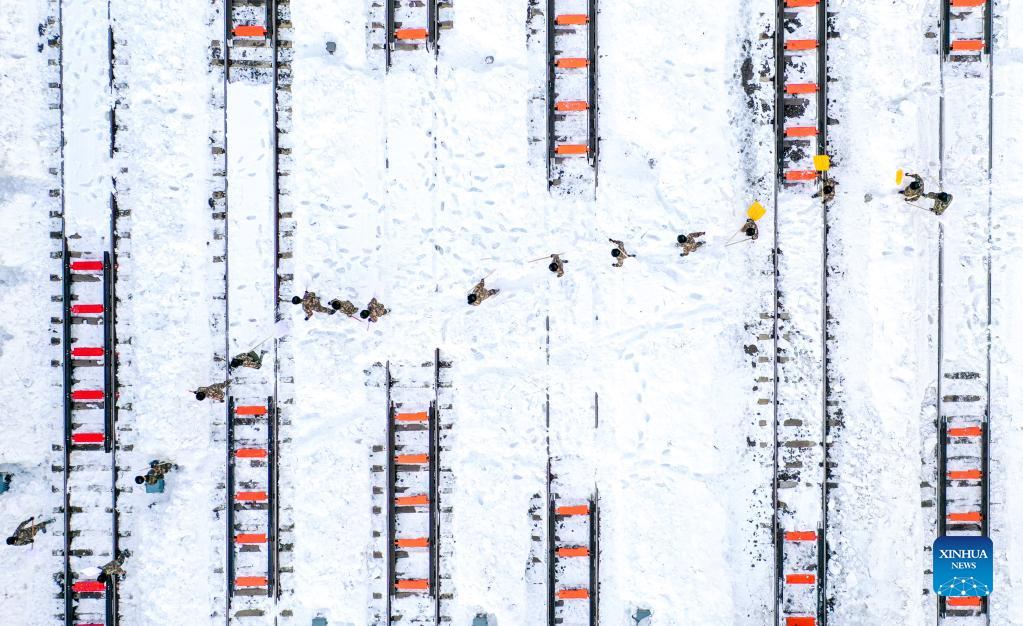 Aerial photo shows armed police officers cleaning snow at a railway switchyard in Tongliao, north China's Inner Mongolia Autonomous Region, Nov. 11, 2021. Tongliao City in north China's Inner Mongolia has been walloped by the strongest snowstorm ever recorded. Faced with the recent cold weather and snowstorms, the local authorities have launched an emergency program to ensure transportation safety, power supply as well as agricultural and husbandry production, guaranteeing people's normal life. (Xinhua/Lian Zhen)