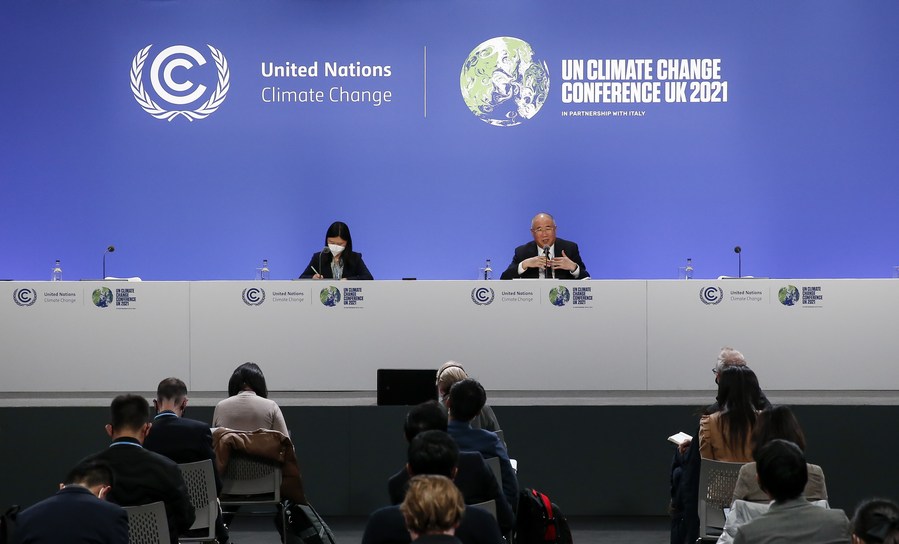 Xie Zhenhua (R), China's special envoy for climate change, speaks at a press conference during the 26th session of the Conference of the Parties (COP26) to the United Nations Framework Convention on Climate Change in Glasgow, Scotland, the United Kingdom, on Nov. 10, 2021. (Xinhua/Han Yan)