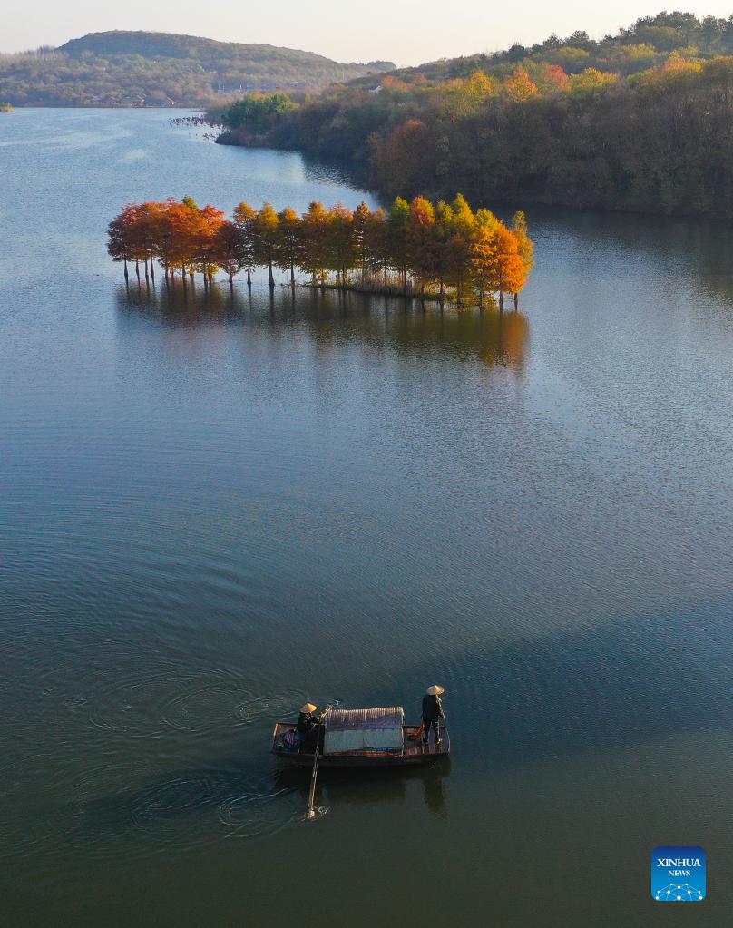 Aerial photo taken on Nov. 14, 2021 shows a winter landscape of Tianquan Lake in Xuyi County, east China's Jiangsu Province. (Xinhua/Ji Chunpeng)