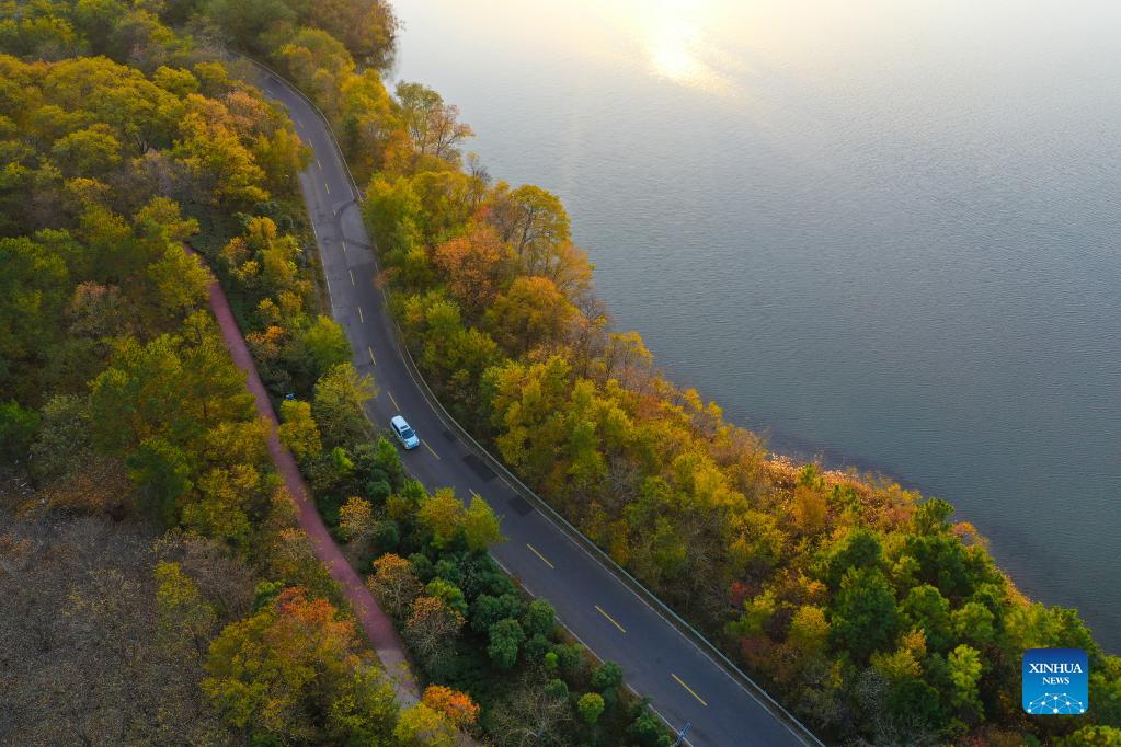 Aerial photo taken on Nov. 13, 2021 shows a winter landscape of Tianquan Lake in Xuyi County, east China's Jiangsu Province. (Xinhua/Ji Chunpeng)