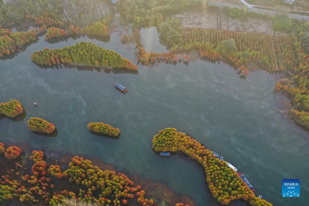 Aerial photo taken on Nov. 14, 2021 shows a winter landscape of Tianquan Lake in Xuyi County, east China's Jiangsu Province. (Xinhua/Ji Chunpeng)