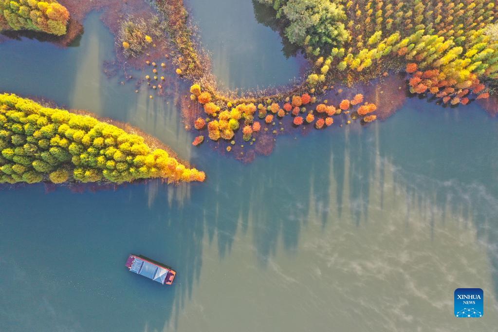 Aerial photo taken on Nov. 14, 2021 shows a winter landscape of Tianquan Lake in Xuyi County, east China's Jiangsu Province. (Xinhua/Ji Chunpeng)