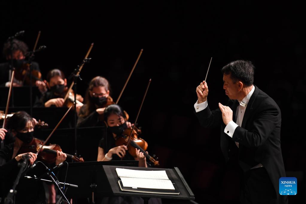 Conductor Cai Jindong (R) and the New York City Ballet Orchestra perform during the concert "East/West: A Symphonic Celebration" at Lincoln Center in New York, the United States, Nov. 13, 2021. A concert held in New York City's Lincoln Center on Saturday night charmed the audience with multiple Chinese musical pieces. The concert is part of "Image China," a cultural exchange initiative presented by China Arts and Entertainment Group, which aims to introduce traditional and contemporary Chinese performing arts to audiences around the world. (Xinhua/Li Rui)
