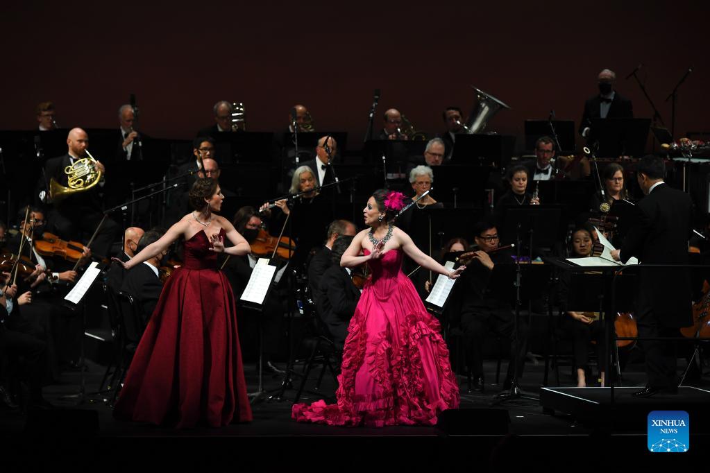 Soprano Esther Maureen Kelly (L, front) and coloratura soprano Holly Flack (R, front) sing during the concert "East/West: A Symphonic Celebration" at Lincoln Center in New York, the United States, Nov. 13, 2021. A concert held in New York City's Lincoln Center on Saturday night charmed the audience with multiple Chinese musical pieces. The concert is part of "Image China," a cultural exchange initiative presented by China Arts and Entertainment Group, which aims to introduce traditional and contemporary Chinese performing arts to audiences around the world. (Xinhua/Li Rui)