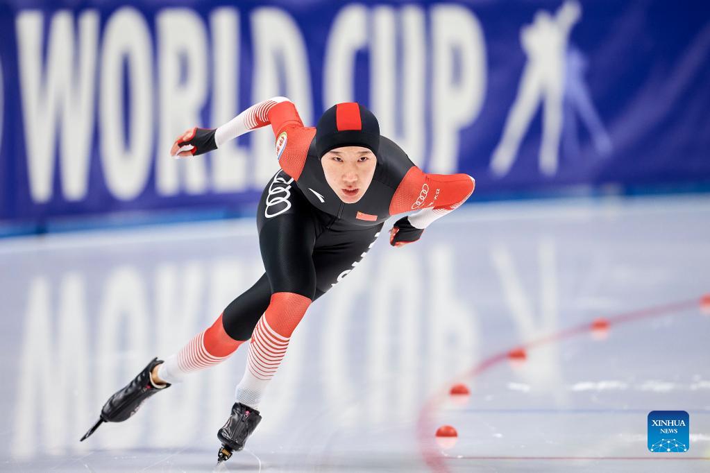 Han Mei of China competes during the women's 1500m division A race at the ISU Speed Skating World Cup in Tomaszow Mazowiecki, Poland, Nov. 14, 2021. (Photo by Rafal Oleksiewicz/Xinhua)
