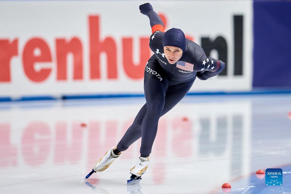 Brittany Bowe of the United States competes during the women's 1500m division A race at the ISU Speed Skating World Cup in Tomaszow Mazowiecki, Poland, Nov. 14, 2021. (Photo by Rafal Oleksiewicz/Xinhua)