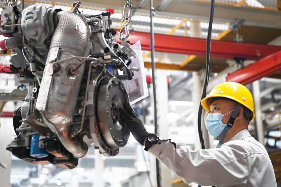 A worker operates at a workshop of the Dongan Auto Engine Co., Ltd. in Harbin City of northeast China's Heilongjiang Province, April 9, 2021. (Xinhua/Wang Jianwei)