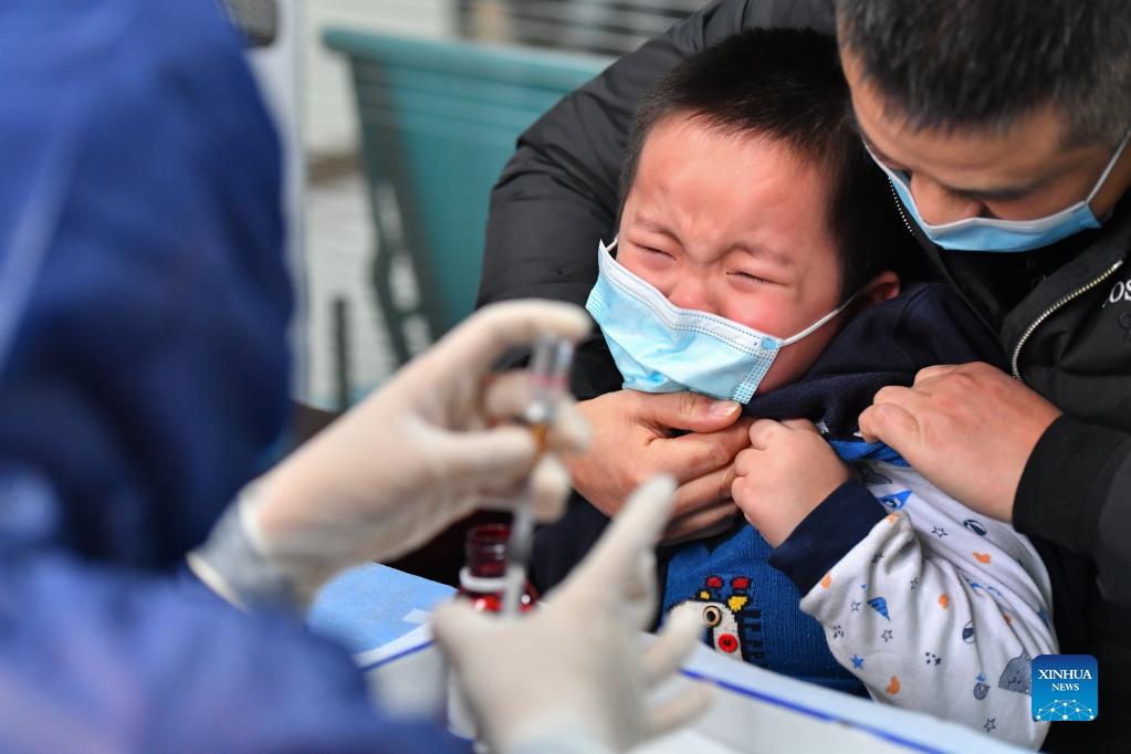 A child receives a dose of COVID-19 vaccine at a community medical service center in Changsha, central China's Hunan Province, Nov. 15, 2021. Changsha has recently launched a COVID-19 vaccination campaign for children aged 3 to 11. (Xinhua/Chen Zeguo)