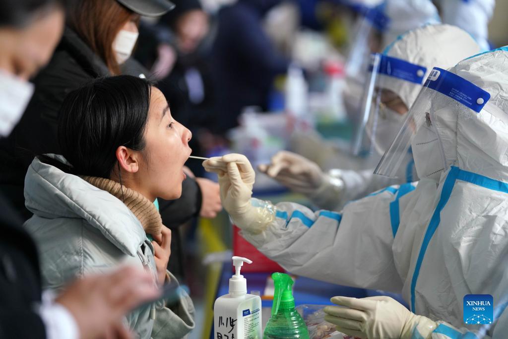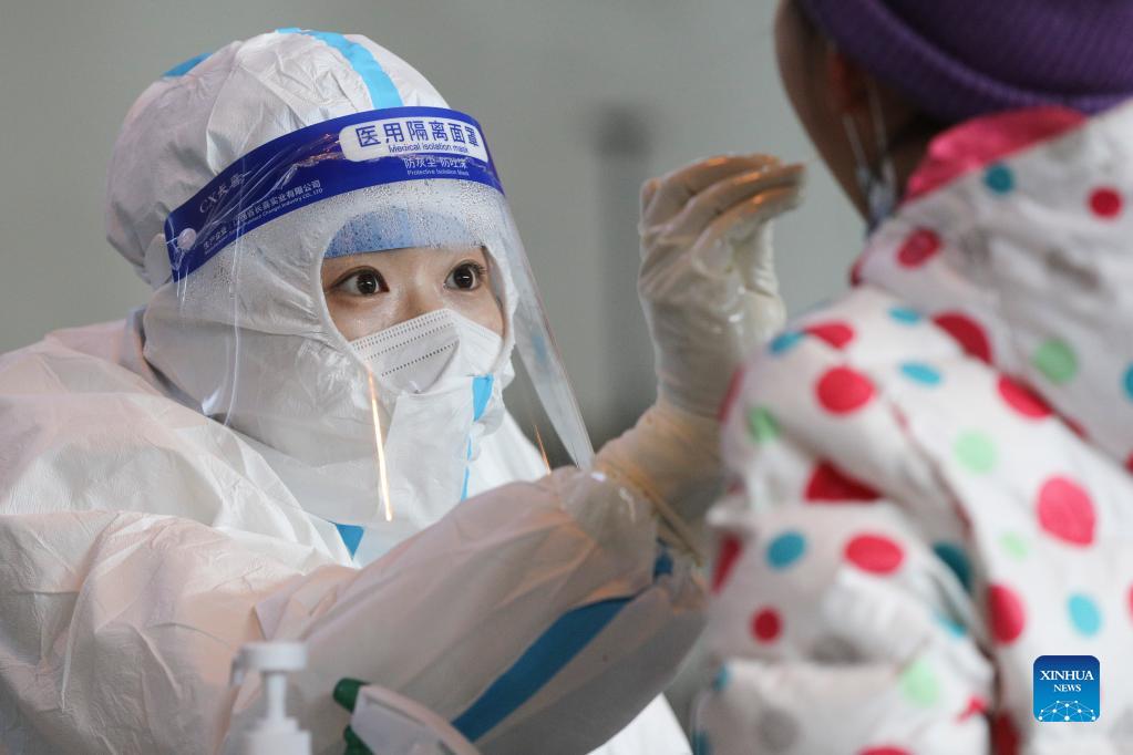 Medical workers take swab samples from citizens at a nucleic acid testing site in Xiangfang District of Harbin, northeast China's Heilongjiang Province, Nov. 15, 2021. Harbin started a new round of all-inclusive nucleic acid testing from 8 a.m. Monday to 8 a.m. Wednesday. The whole city will be downgraded to low-risk for COVID-19 if all samples collected come back negative. (Xinhua/Wang Jianwei)
