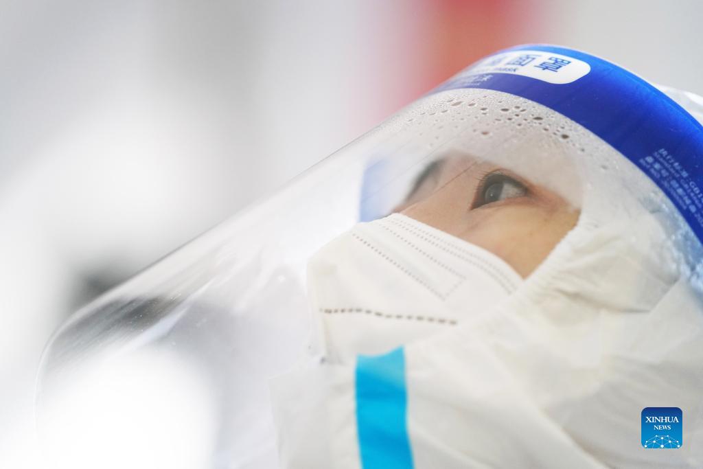 A medical worker works at a nucleic acid testing site in Xiangfang District of Harbin, northeast China's Heilongjiang Province, Nov. 15, 2021. Harbin started a new round of all-inclusive nucleic acid testing from 8 a.m. Monday to 8 a.m. Wednesday. The whole city will be downgraded to low-risk for COVID-19 if all samples collected come back negative. (Xinhua/Zhang Tao)