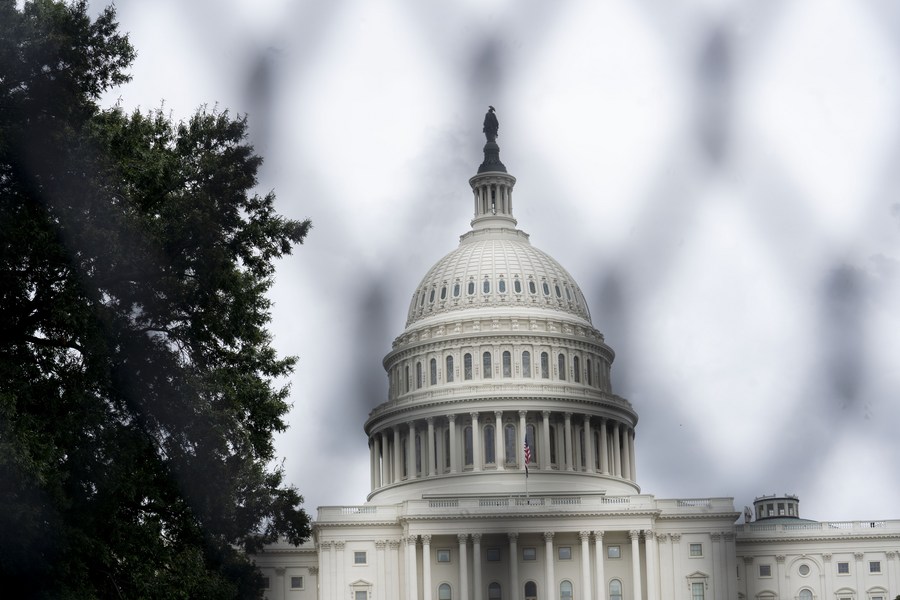 Photo taken on Sept. 17, 2021 shows the U.S. Capitol building, seen through a barrier fence, in Washington, D.C. (Xinhua/Liu Jie)