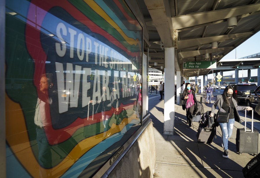 Travellers walk past a billboard of COVID-19 prevention in a terminal at John F. Kennedy International Airport in New York, the United States, Nov. 8, 2021. (Xinhua/Wang Ying)